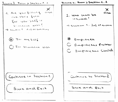 When entering a section from the overview, a hint text clearly states which section the user is in and how many questions remain. This contextual guidance helps users navigate the form with ease and understanding as seen in Frame 3.