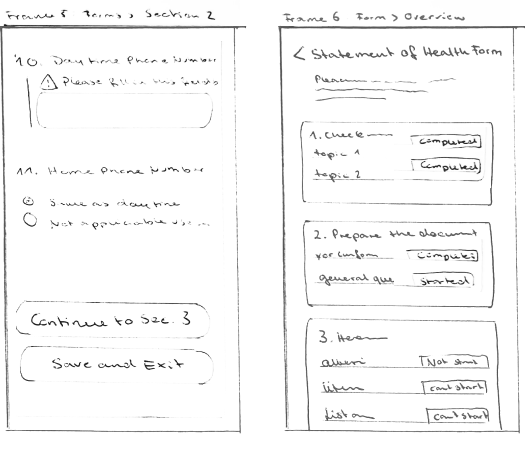 Health forms are organized into distinct sections, allowing users to complete each section independently. This modular approach streamlines the form completion process, making it more manageable and less overwhelming for users. The app clearly indicates the status of each section, showing what still needs to be filled out, what has been started, what is completed, and what cannot yet be started. This organized structure is shown in Frame Two.