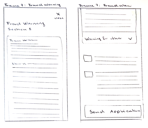 In Frame Seven, we can see the fraud warning, which contains a lot of information specific to each state. The form should recognize the state the user has provided in Section 2 about general information and display the correct section for the user's state. Additionally, warnings for other states can be accessed via an accordion. Since the fraud warning is usually the last step in the process, if all information is filled out, the user will see a button to send the application. If not all information is filled out, there should also be a save and exit button. The send application button could also be placed more prominently in the overview of the health form.