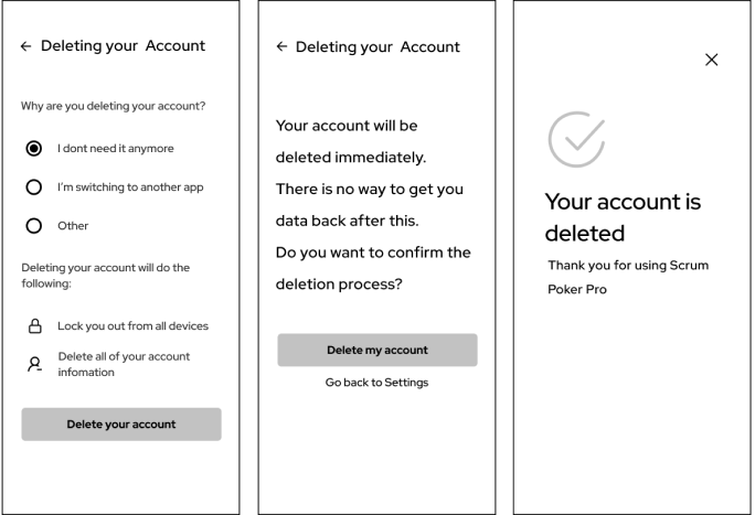 The account deletion has no complicated steps an can be easily found in the account settings. After clicking "delete account" there is a double confirmation to ensure you don't accidentally delete the account. After a successful deletion, you get a visual confirmation on the screen