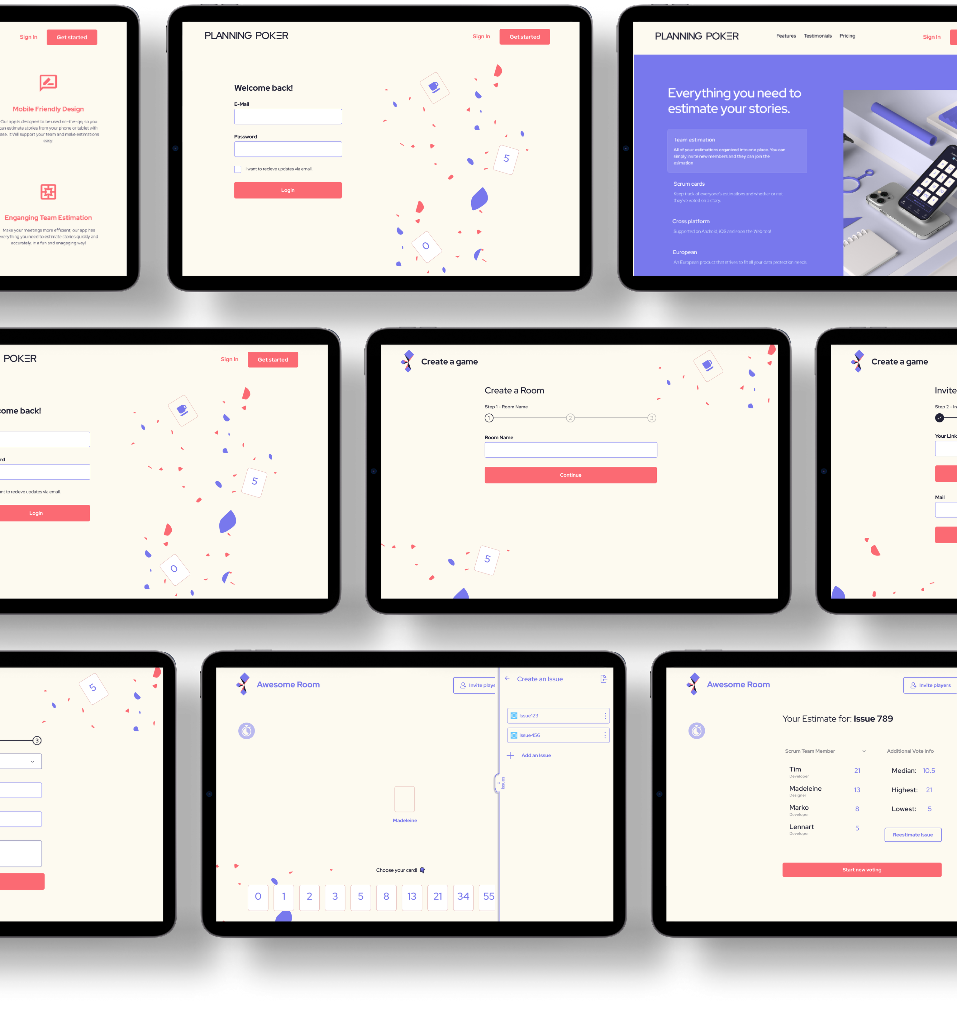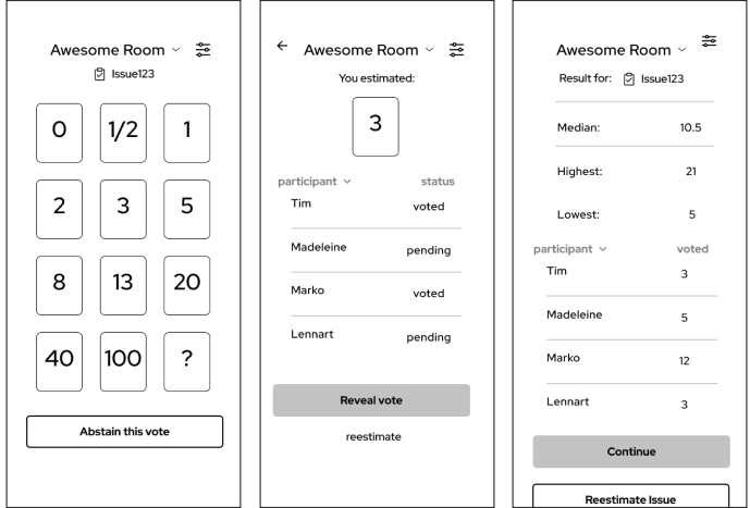 Estimation Screen: A screen showing the card deck and issue details. Voting Screen: A screen showing participant votes and results.